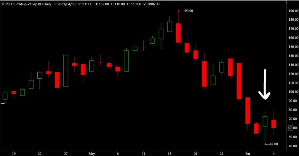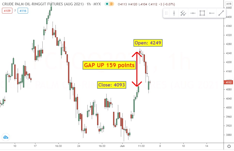 Pada tarikh yang sama di mana pada market FCPO kontrak Aug 2021 ada gap yang besar.